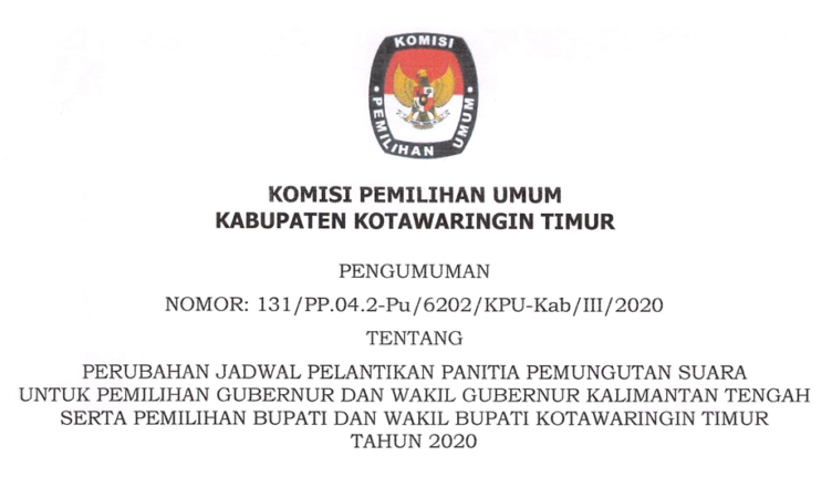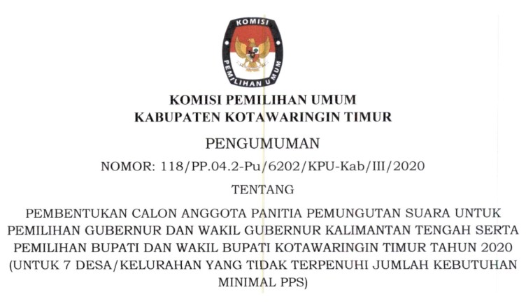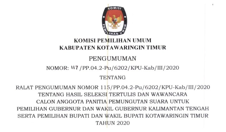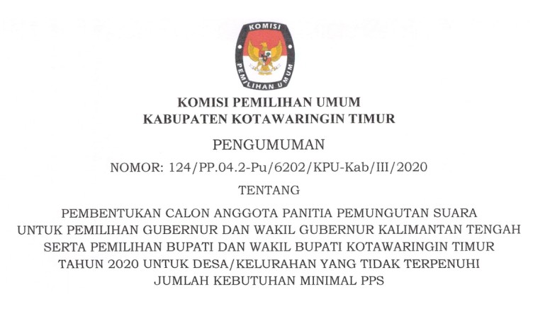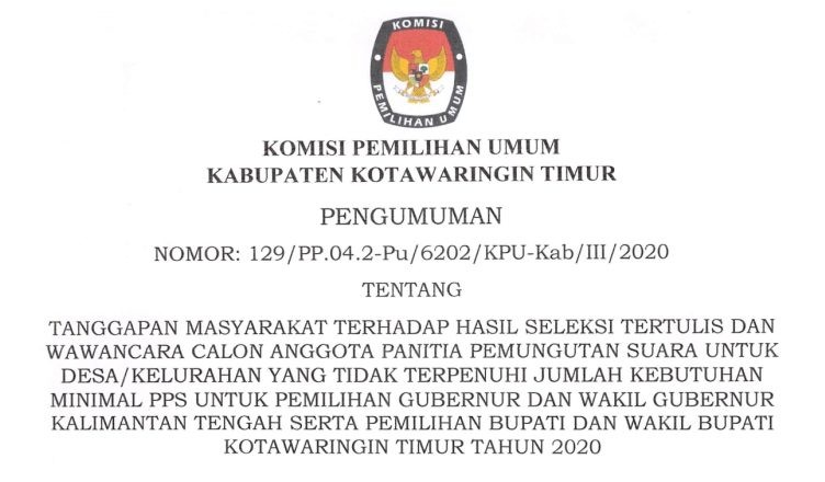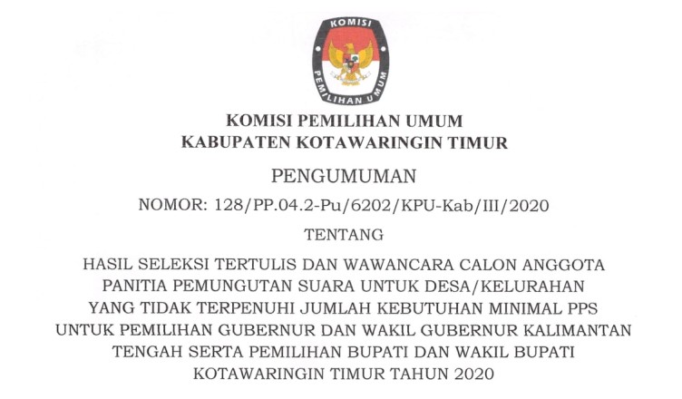 Berikut disampaikan sehubungan dengan pengumuman Nomor : 128/PP.04.2-Pu/6202/KPU-Kab/III/2020 tanggal 17 Maret 2020 tentang Hasil Seleksi Tertulis dan Wawancara Calon Anggota Panitia Pemungutan Suara untuk Desa/Kelurahan yang tidak Terpenuhi Jumlah Kebutuhan Minimal PPS untuk Pemilihan Gubernur dan Wakil Gubernur Kalimantan Tengah serta Pemilihan Bupati dan Wakil Bupati Kotawaringin Timur Tahun 2020, maka diumumkan kepada seluruh masyarakat … SELENGKAPNYA KLIK DISINI