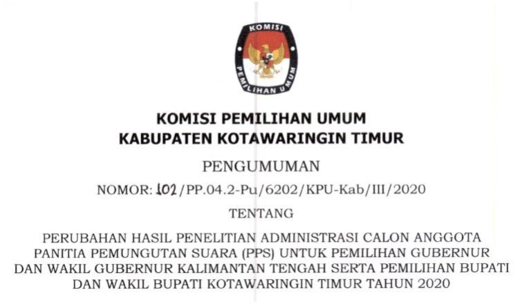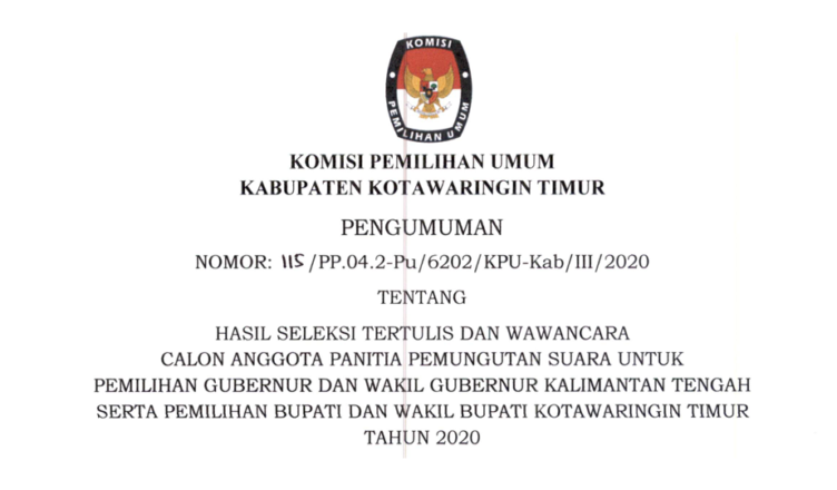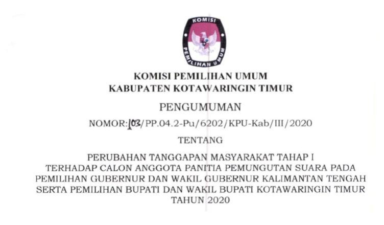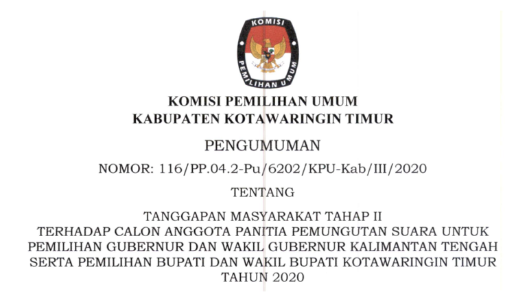 Berikut disampaikan Pengumuman Tanggapan Masyarakat Tahap II Terhadap Calon Anggota Panitia Pemungutan Suara Untuk Pemilihan Gubernur dan Wakil Gubernur Kalimantan Tengah serta Pemilihan Bupati dan Wakil Bupati Kotawaringin Timur Tahun 2020. Selengkapnya KLIK DISINI