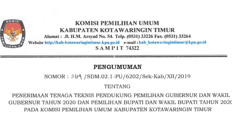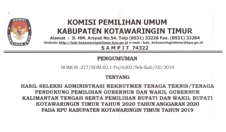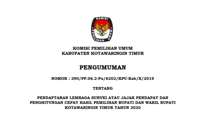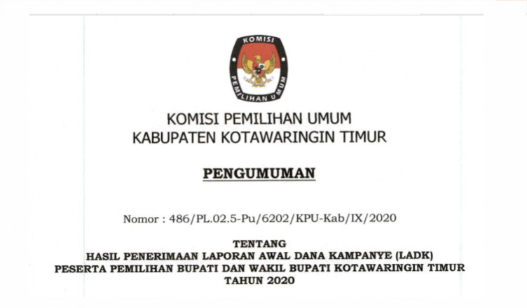 Berikut disampaikan Pengumuman Nomor 486/PL.02.5-Pu/6202/KPU-Kab/IX/2020 tentang Hasil Penerimaan Laporan Awal Dana Kampanye (LADK) Peserta Pemilihan Bupati dan Wakil Bupati Kotawaringin Timur Tahun 2020 UNDUH