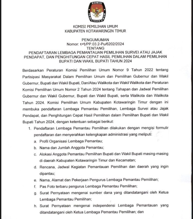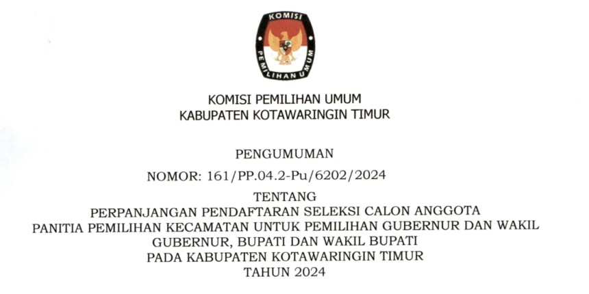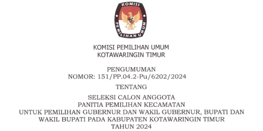 Dalam rangka pembentukan Calon Anggota Panitia Pemilihan Kecamatan untuk Pemilihan Gubernur dan Wakil Gubernur, Bupati dan Wakil Bupati Tahun 2024, Komisi Pemilihan Umum Kabupaten Kotawaringin Timur mengundang Warga Negara Indonesia yang memenuhi kualifikasi untuk mendaftarkan diri menjadi Panitia Pemilihan Kecamatan untuk Pemilihan Gubernur dan Wakil Gubernur, Bupati dan Wakil Bupati dengan ketentuan sebagai berikut:
