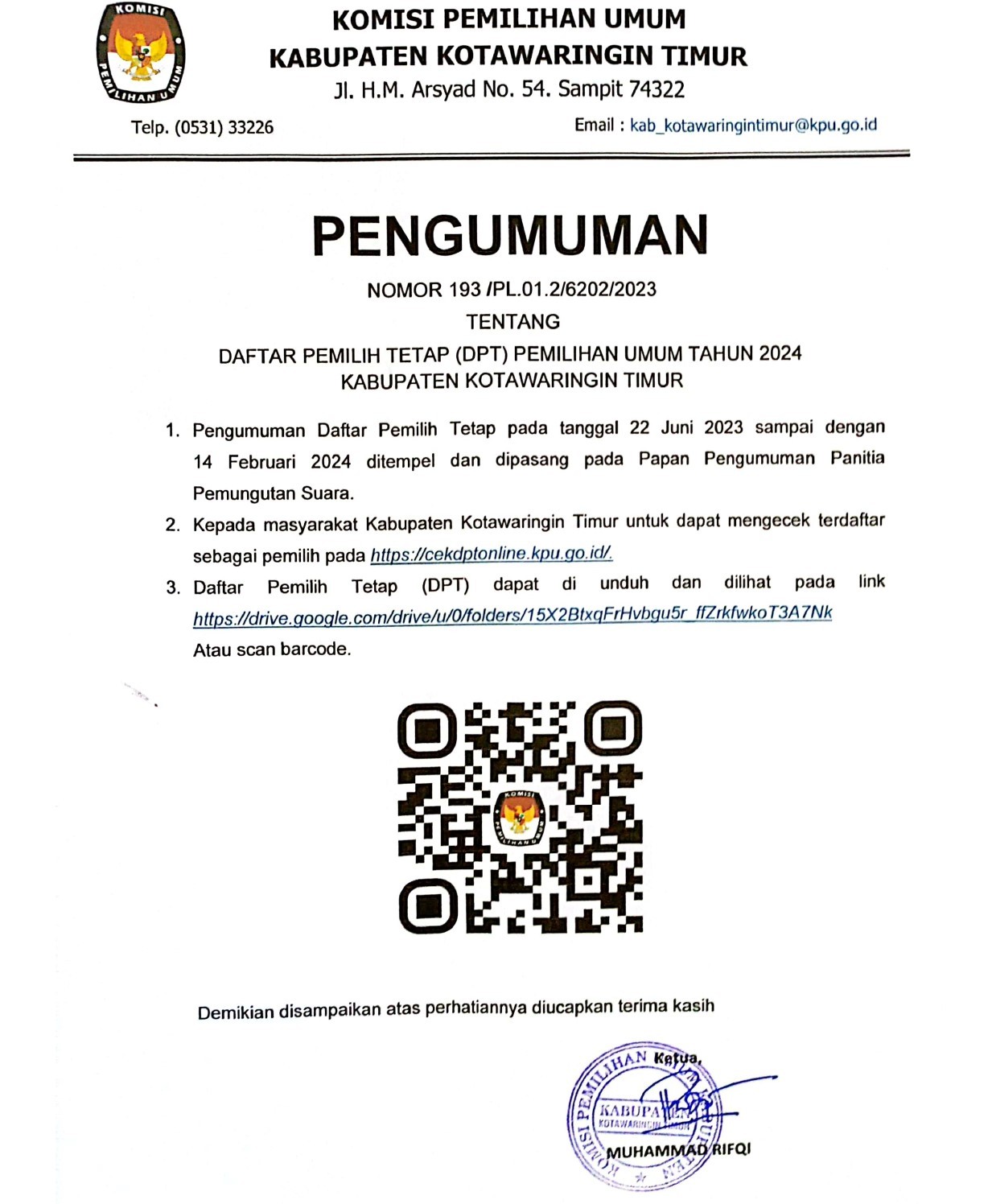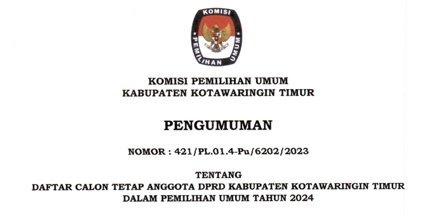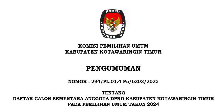 Bahwa untuk melaksanakan ketentuan pasal 70 Peraturan KPU Nomor 10 Tahun 2023 tentang Pencalonan Anggota Dewan Perwakilan Rakyat Dewan Perwakilan Rakyat Daerah Provinsi, dan Dewan Perwakilan Rakyat Kabupaten/Kota, KPU Kabupaten Kotawaringin Timur mengumumkan Daftar Calon Sementara (DCS) Anggota DPRD Kabupaten Kotawaringin Timur dan persentase keterwakilan perempuan dalam Daftar Calon Sementara (DCS) sebagaimana terlampir.