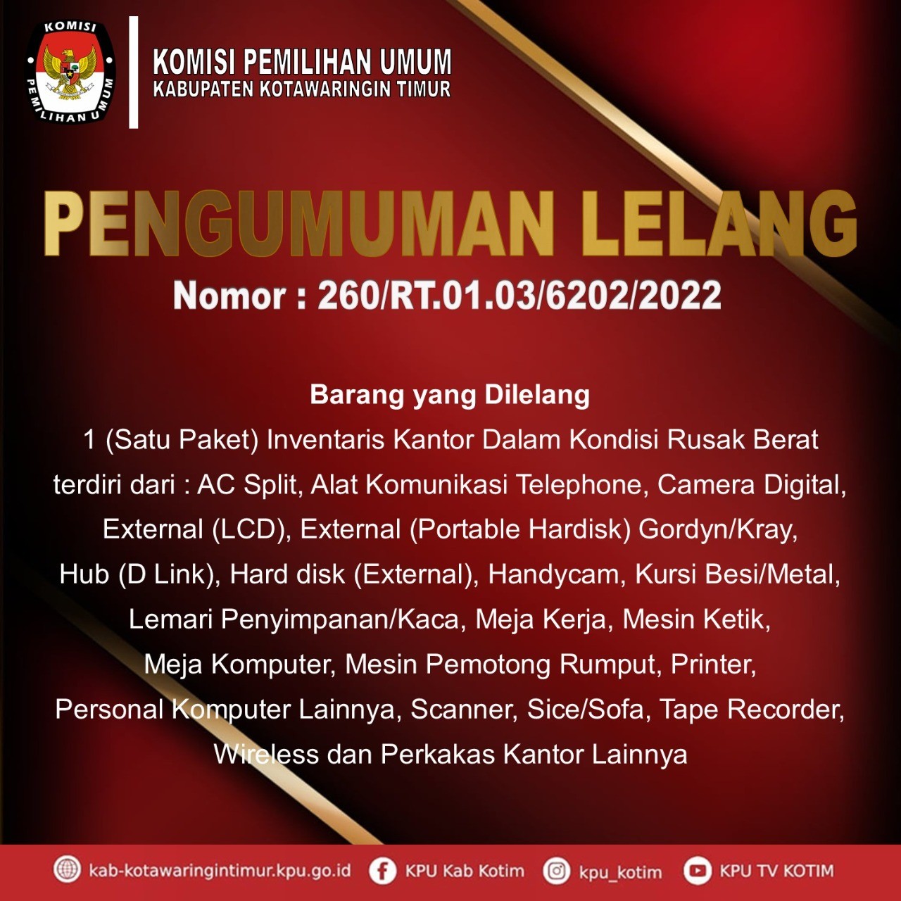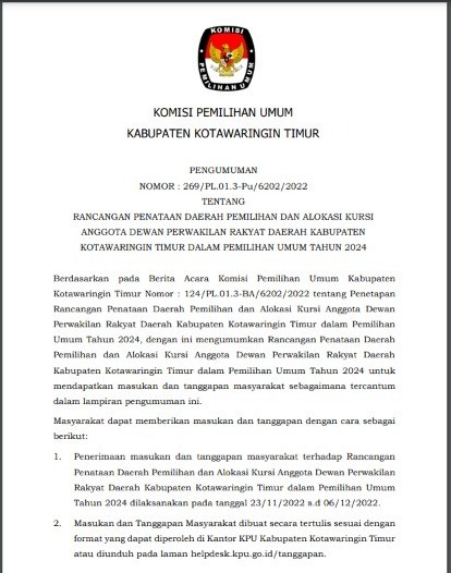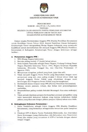 Dalam rangka Pembentukan Anggota PPK (Panitia Pemilihan Kecamatan) untuk Pemilihan Umum tahun 2024, Komisi Pemilihan Umum Kabupaten Kotawaringin Timur mengundang Warga Negara Indonesia yang memenuhi kualifikasi untuk mendaftarkan diri menjadi anggota PPK di Kabupaten Kotawaringin Timur, berikut Pengumumannya.
