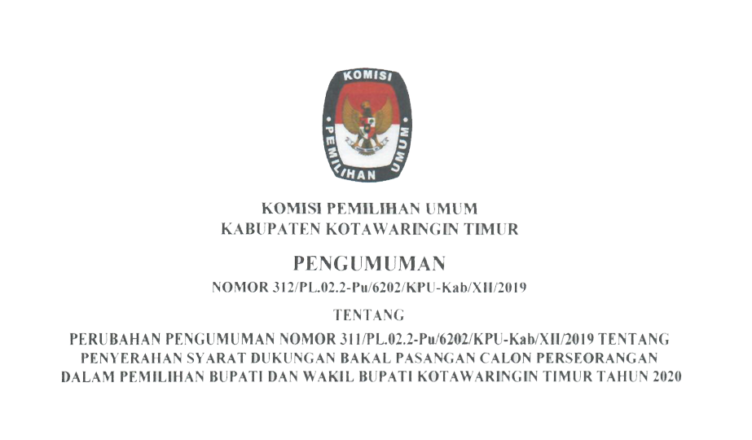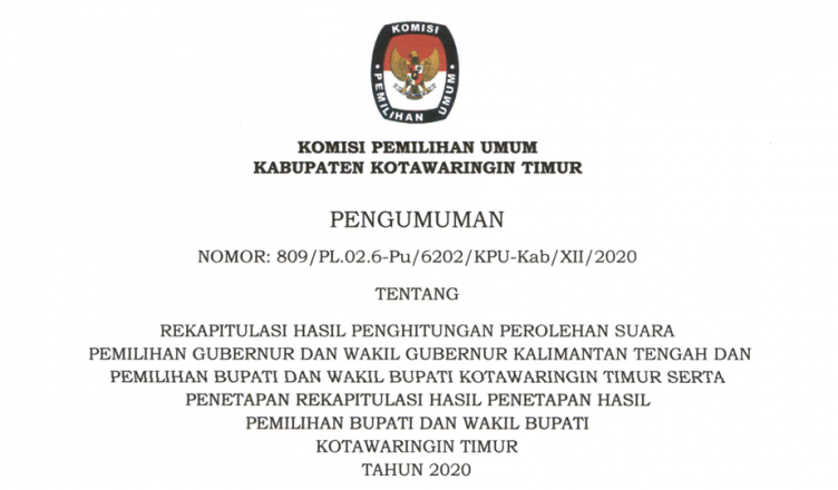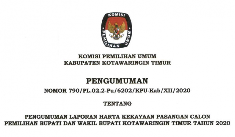 Pengumuman Nomor 790/PL.02.2-Pu/6202/KPU-Kab/XII/2020 tentang Pengumuman Laporan Harta Kekayaan Pasangan Calon Pemilihan Bupati dan Wakil Bupati Kotawaringin Timur Tahun 2020 – UNDUH